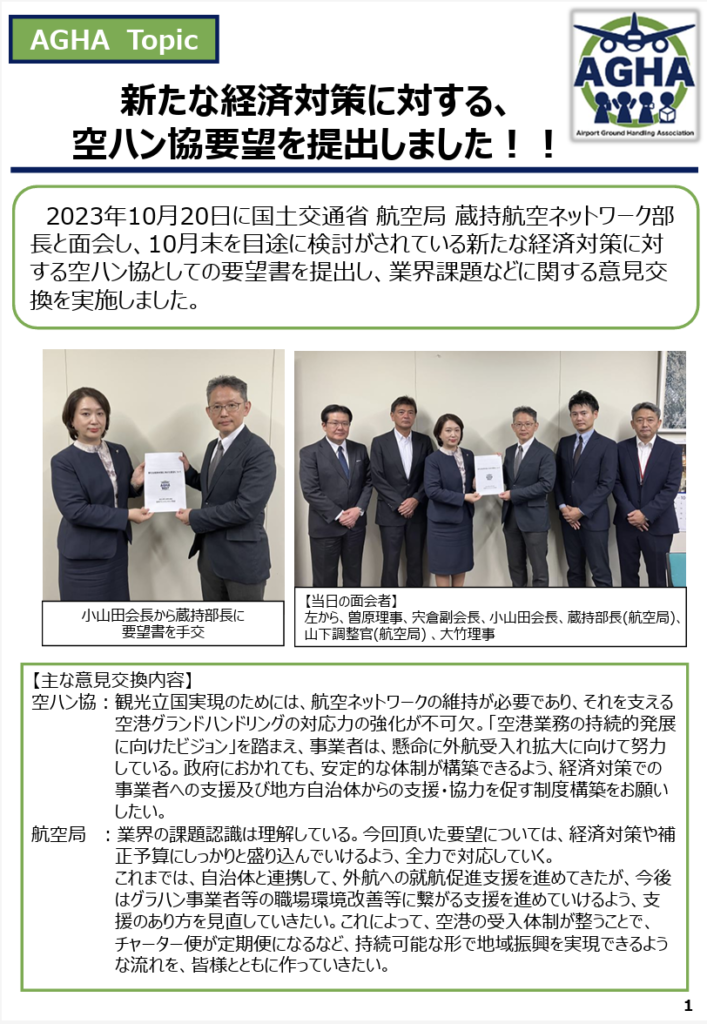 2023年10月20日、空ハン協は国土交通省航空局の蔵持部長と面会し、新たな経済対策に関する要望書を提出しました。 要望では、観光立国実現のための航空ネットワーク維持と空港グランドハンドリングの強化が求められました。 航空局は業界の課題を理解し、支援のあり方を見直す意向を示し、持続可能な地域振興を目指すと述べました。