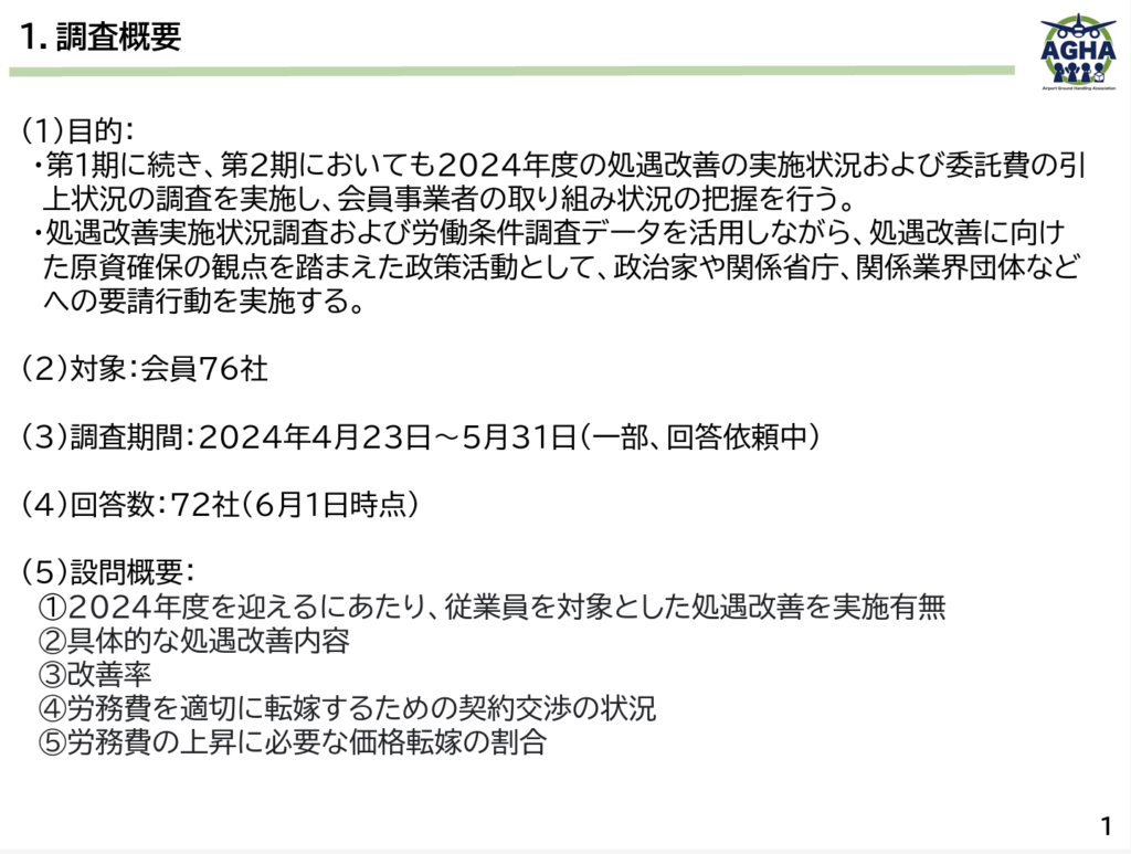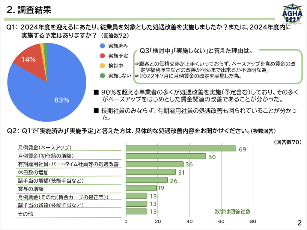 2024年度の処遇改善実施状況調査では、会員事業者の83%が従業員の処遇改善を実施または予定しており、主に賃金関連の改善が行われています。 契約交渉においては、70%近い事業者が価格転嫁の交渉を行い、約半数が70%以上の転嫁を実施しています。 今後は、業界全体の労働条件を確認するため、第三者機関による調査を実施し、適切な労務費の転嫁を支援する方針です。