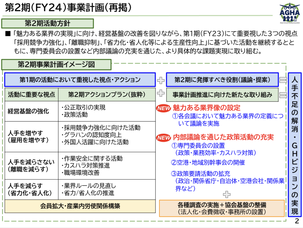 空港グランドハンドリング協会は、会員数を104社に増やし、61空港での活動を強化しています。 処遇改善が進み、業界全体の労働条件向上を目指す調査を実施予定です。 また、カスタマーハラスメント対策としてガイドライン作成に着手し、業界の認知度向上に向けた教育活動も行っています。 2030年の訪日6000万人目標に向け、魅力ある業界像の設定を進めています。